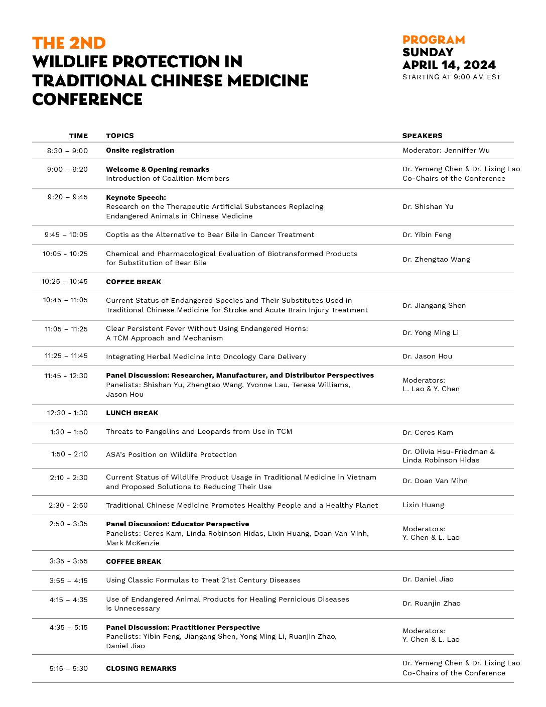 At this year's conference, worldwide experts will share experiences in the Chinese Medical Practice that are successful without use of endangered wildlife products. The diverse group of international speakers includes educators, researchers, practitioners, and herbal manufacturers from around the world. Topics covered include cancer treatment, herbal applications in hospital settings, cardiovascular treatments, herbal substitutes for endangered species and Shang Han Lun (Treatise on Cold Damage).